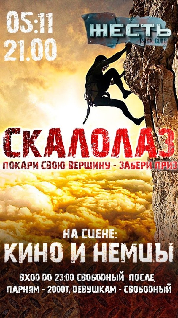 04.11.22. – 21:00 @zhest.club На сцене: Cover Drive #dj DJ Nik.El Михаил 21:00 – 22:00 #freeentrance 22:00 – 04:00 Мужчины – 2 000 kzt 21:00 – 04:00 Девушки заходят бесплатно _____ 05.11.22. – 21:00 @zhest.club #СКАЛОЛАЗ Покари свою вершину — забери приз на сцене: Кино и Немцы #dj DJ Nik.El Михаил 21:00 – 23:00 #freeentrance 23:00 – 04:00 Мужчины – 2 000 тг 21:00 – 04:00 Девушки — бесплатно..