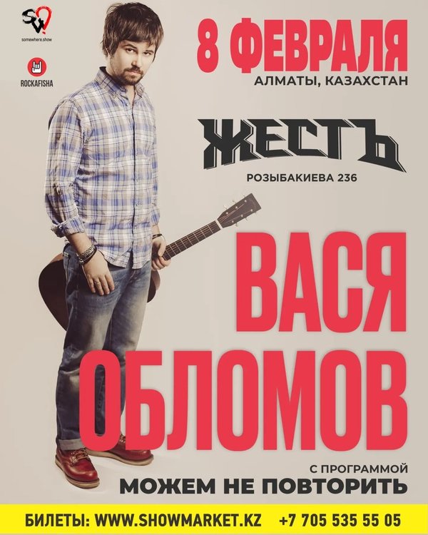 а в передаче «Точь-в-точь» в поисках смысла песни «Еду в Магадан» Леонид Ярмольник поругался с Геннадием Хазановым. Обе части популярного фильма «ДухLess» заканчиваются одинаково: песней Васи Обломова. По текстам его песен уже сейчас будущие филологи пишут дипломные работы, а через сто лет вообще можно будет изучать историю России начала двадцать первого века. 8 февраля Вася Обломов выступит в Алматы в клубе Жесть Цены: Танцпол — 15000тг Сидячий, 1 этаж — 17000тг (кол-во сидячих мест ограничено) VIP (2 Этаж, Балкон) — 35000тг
