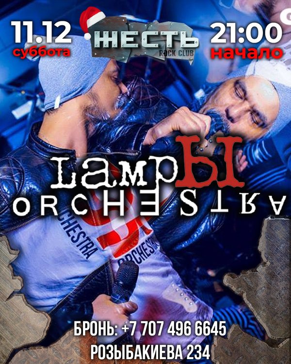 11 декабря, 21:00 LampЫ Orchestra Мс Роман Лазуров Strip GoGo Dj Rus Вход до 23:00 свободный после, парням — 2000Т, девушкам — 1000 Бронь: Розыбакиева 234