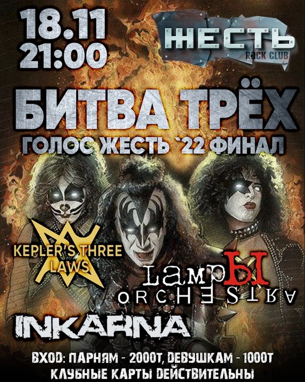 18.11.22. – 21:00 @zhest.club Голос Жесть '22 Финал на сцене: LampЫ Orchestra Kepler’s three laws Inkarna #dj DJ Nik.El Михаил Вход: парням — 2000т, девушкам — 1000т Клубные карты действительны _________ 19.11.22. – 19:00 #METAL THE #PARTY _____ 19.11.22. – 00:00 @zhest.club на сцене: @komancheros_crew #dj DJ Nik.El Михаил Вход: парням — 2000т, девушкам вход свободный Клубные карты действительны