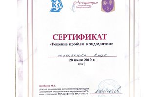 2019 — «Решение проблем в эндодонтии.», организатор «Ассоциация эндодонтистов и пародонтологов РК», лектор Копбаева М.Т.