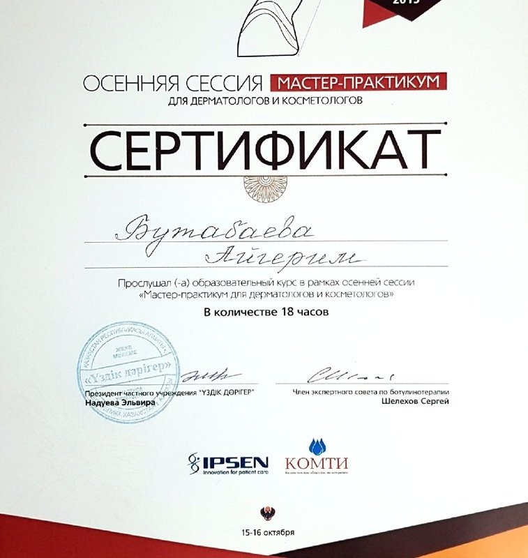 - 2015 г. Казахский Национальный Медицинский Университет, г. Алматы.