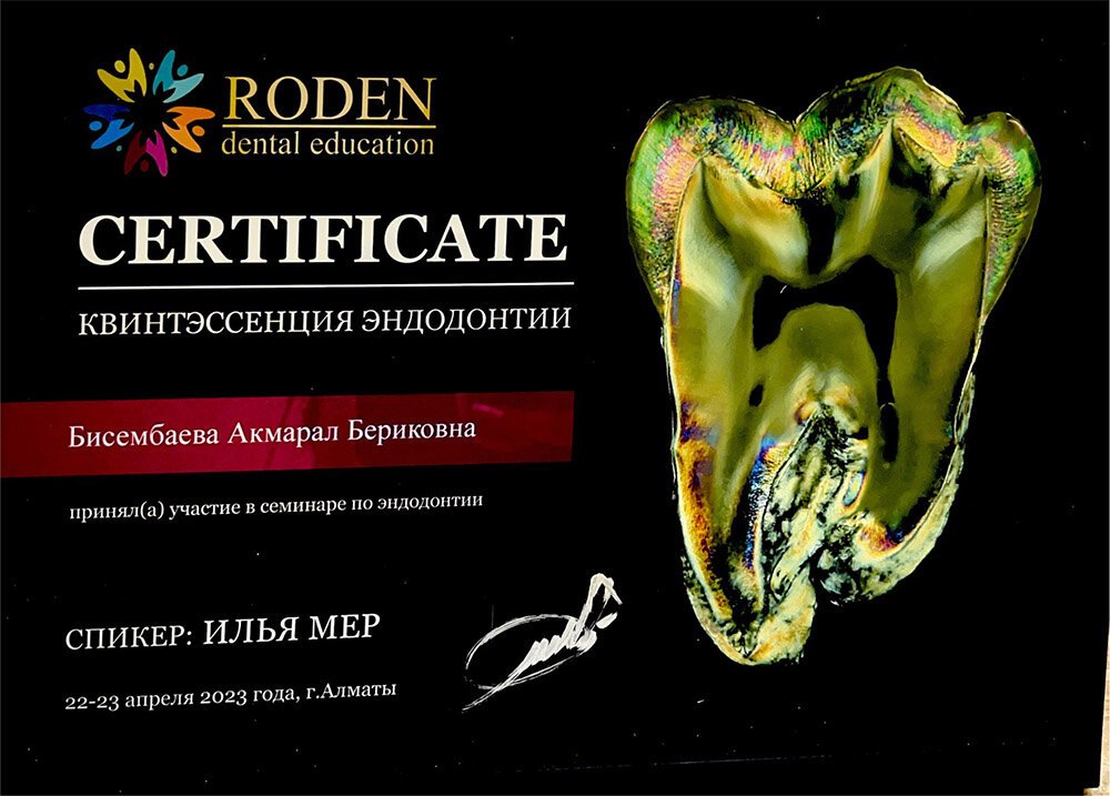 2023 — «Квинтэссенция эндодонтии. Как получить самый лучший результат при лечении корневых каналов», организатор RodenDentalEducation, спикер Илья Мер, г. Алматы;