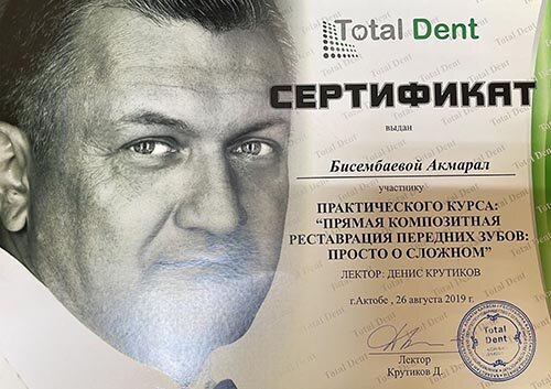 2019 — «Прямая композитная реставрация передних зубов: просто о сложном», организатор компания TotalDent, спикер Денис Крутиков, г. Актобе;