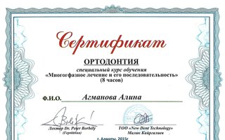 Талантливый специалист, ее клиническое мышление и знания дадут фору большому числу многоопытных докторов. Алина Нурлановна постоянно повышает свою квалификацию — регулярно участвует в конференциях, семинарах, съездах ортодонтов и детских стоматологов.