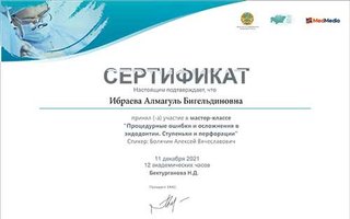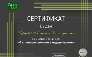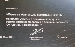 2021 — «Эстетическая реставрация в боковом сегменте. От пломбы к реставрации», организатор учебный центр «Гиппократ dental group», лектор Гаммадаев М.А., г. Алматы;