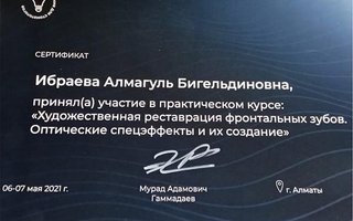 2021 — «Художественная реставрация фронтальных зубов. Оптические спецэффекты и их создание», организатор учебный центр "Гиппократ dental group", лектор Гаммадаев М. А. г. Алматы;