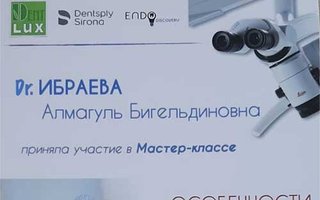 2019 — «Первичная эндодонтия. Мифы и реальность», организатор DentalSchoolAlmaty, лектор Ержанова А. С., г. Алматы;