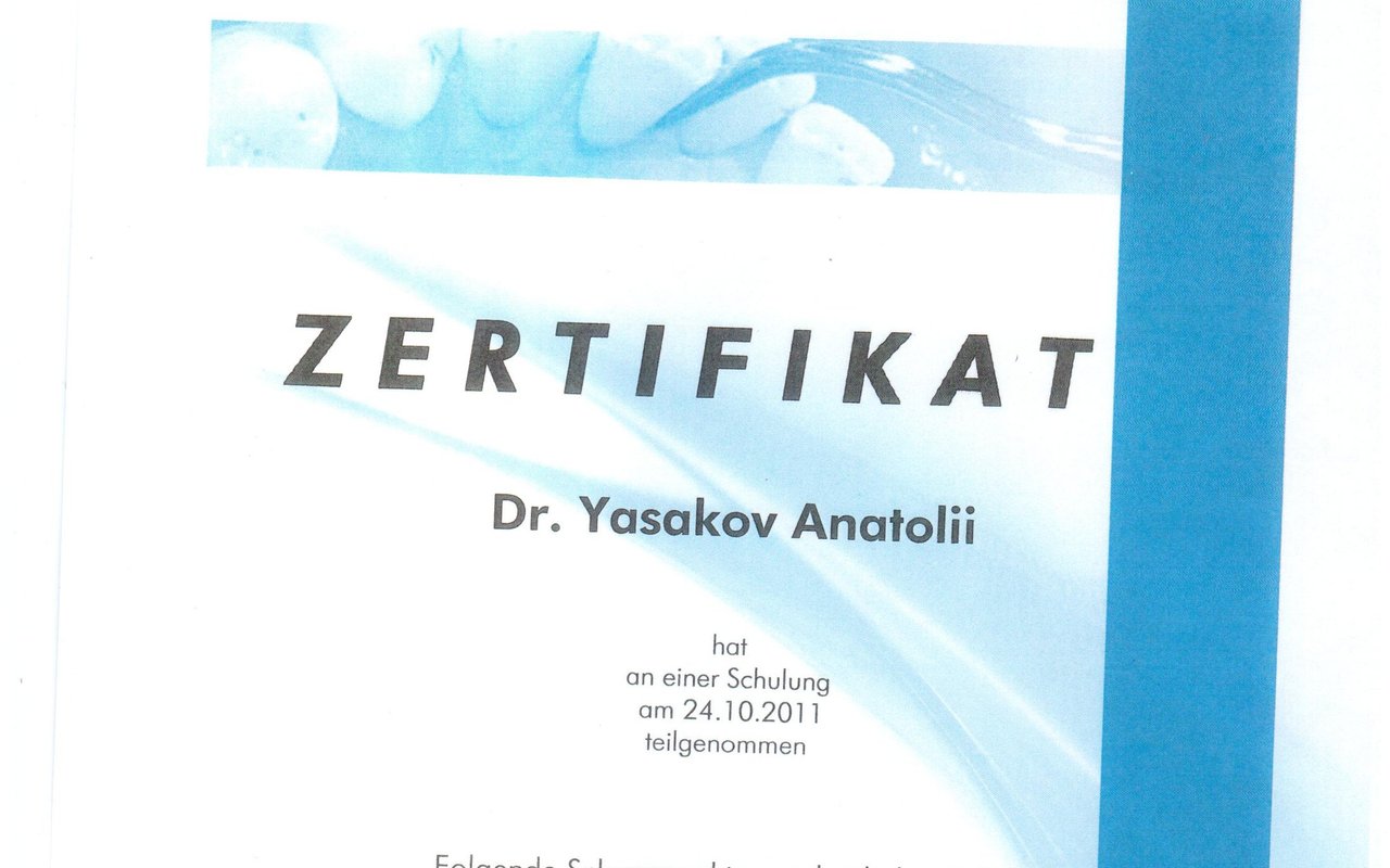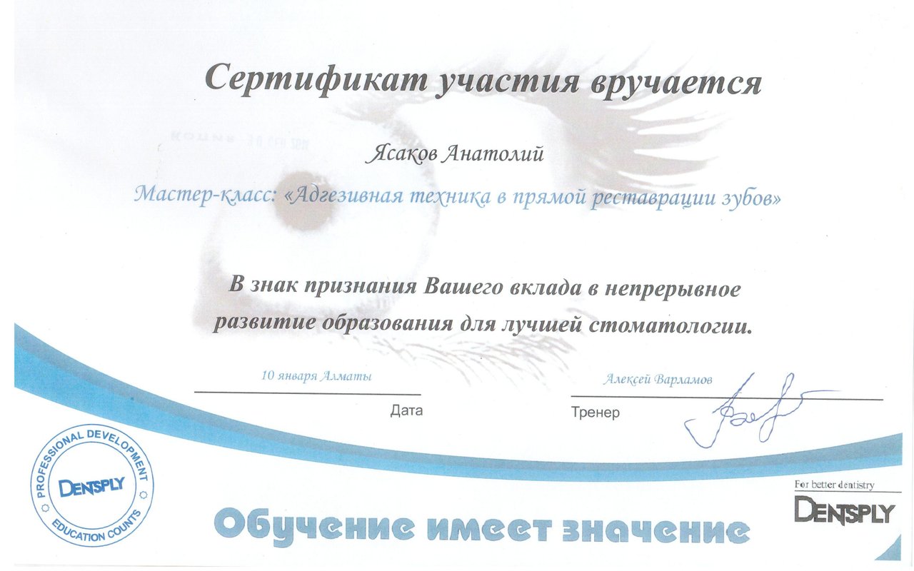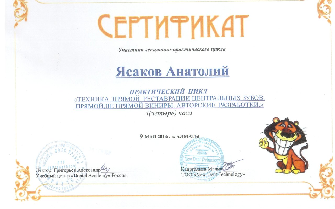 2015 — Сертификат «Керамические виниры и вкладки», г. Алматы