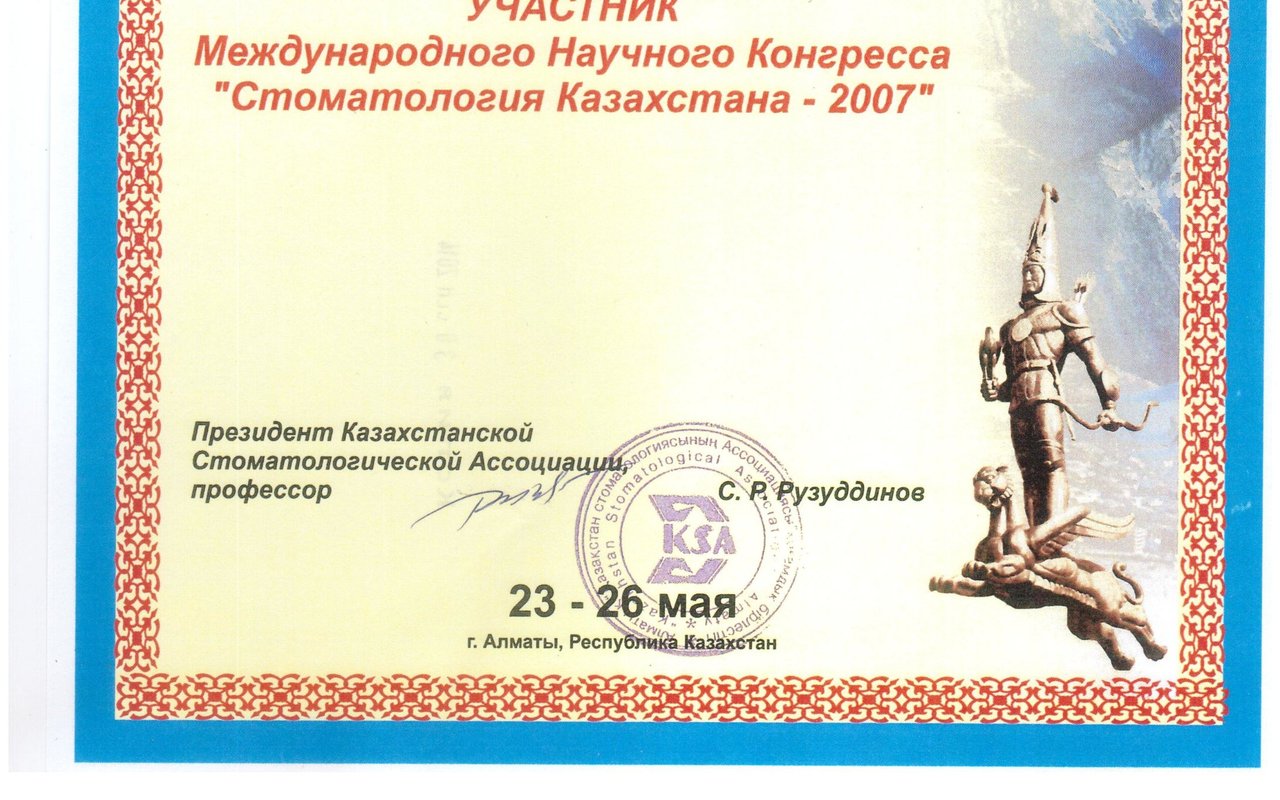 2007 — Участник международного конгресса «Стоматология Казахстана»