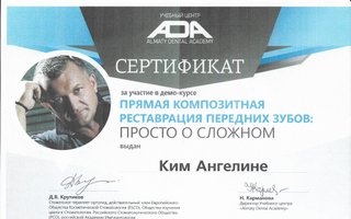 2017 г. - Курс по оказанию первой помощи; 2017 г. - Обучающий курс по применению лазера в стоматологии; 2018 г. - Обучение по программе «Биологические и механические аспекты препарирования корневых каналов»; 2018 г. - Курс по прямым композитным реставрациям передних зубов; 2018 г. - Курс «Использование системы коффердам в практике врача-стоматолога»