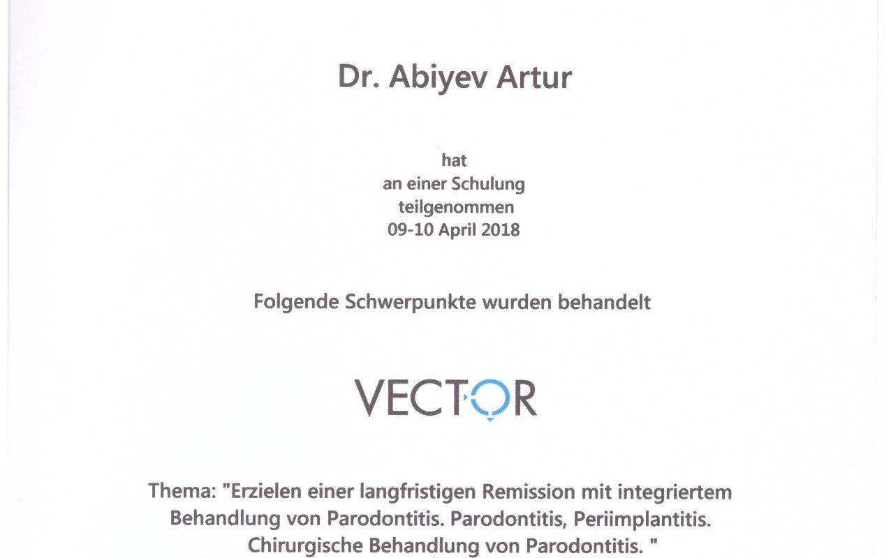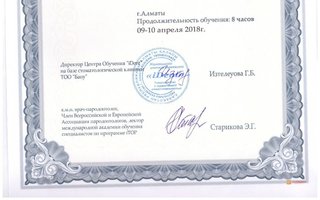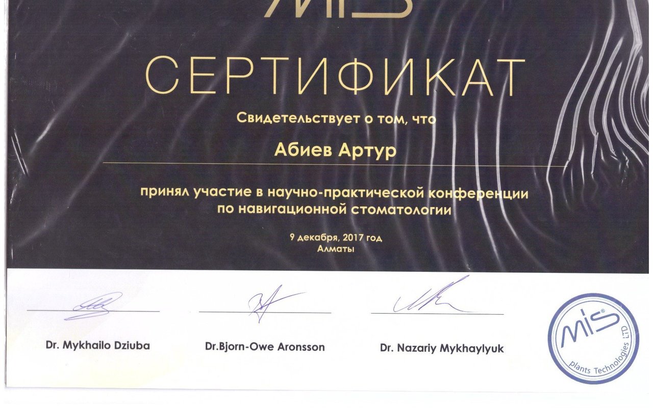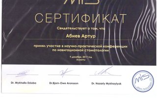 2013 г. «Инновационные технологии в дентальной имплантологии» Лектор: доктор медицинских наук профессор Маргвелашвили В.В. ⠀ 2014 г. «Osstem Implant» AIC Cours; ⠀ 2015 г. «Имплантология. Базовый курс» Лектор: Хван Евгений ⠀ 2017 г. «Базовый курс имплантологии на примере системы Alpha-Bio Tek» Лектор: Баталов Б.С. ⠀ 2019 г. «Адгезивные керамические Реставрации Виниры, накладки, коронки» Лектор: Олег Саркисов