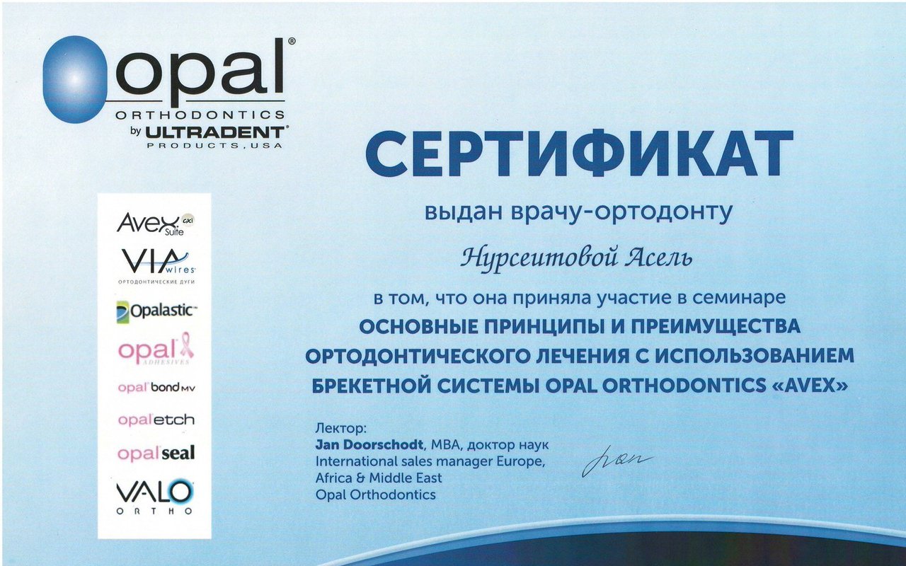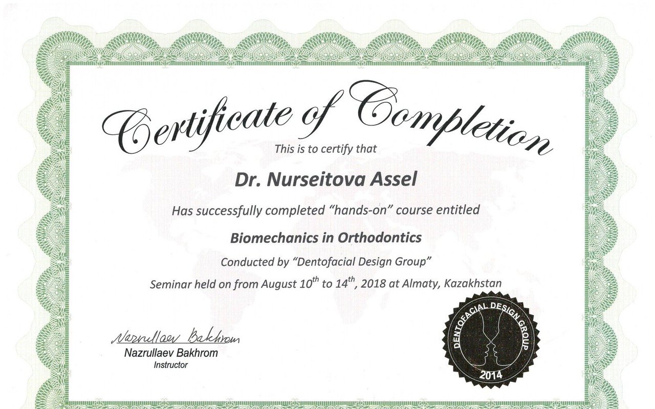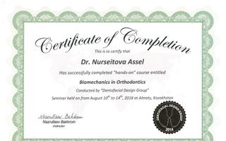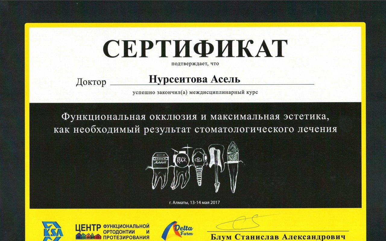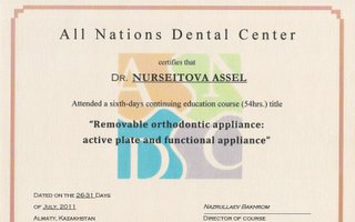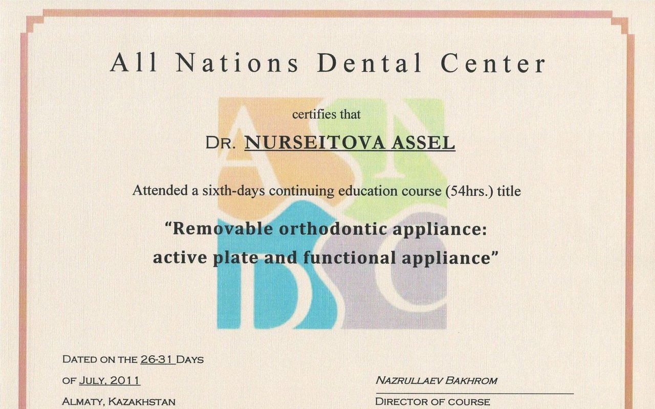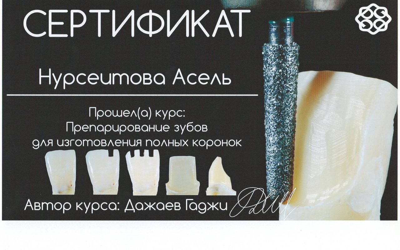 Асель Маратовна - врач от бога. Золотые руки, которые исправят прикус Вам и Вашим деткам. Также Асель Маратовна занимается эстетической стоматологией. Проходила курсы повышения квалификации в Германии и ОАЭ.