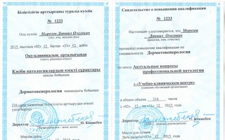 Интернатура по специальности Дерматовенерология - Казахский национальный медицинский университет имени С. Д. Асфендиярова, г. Алматы.