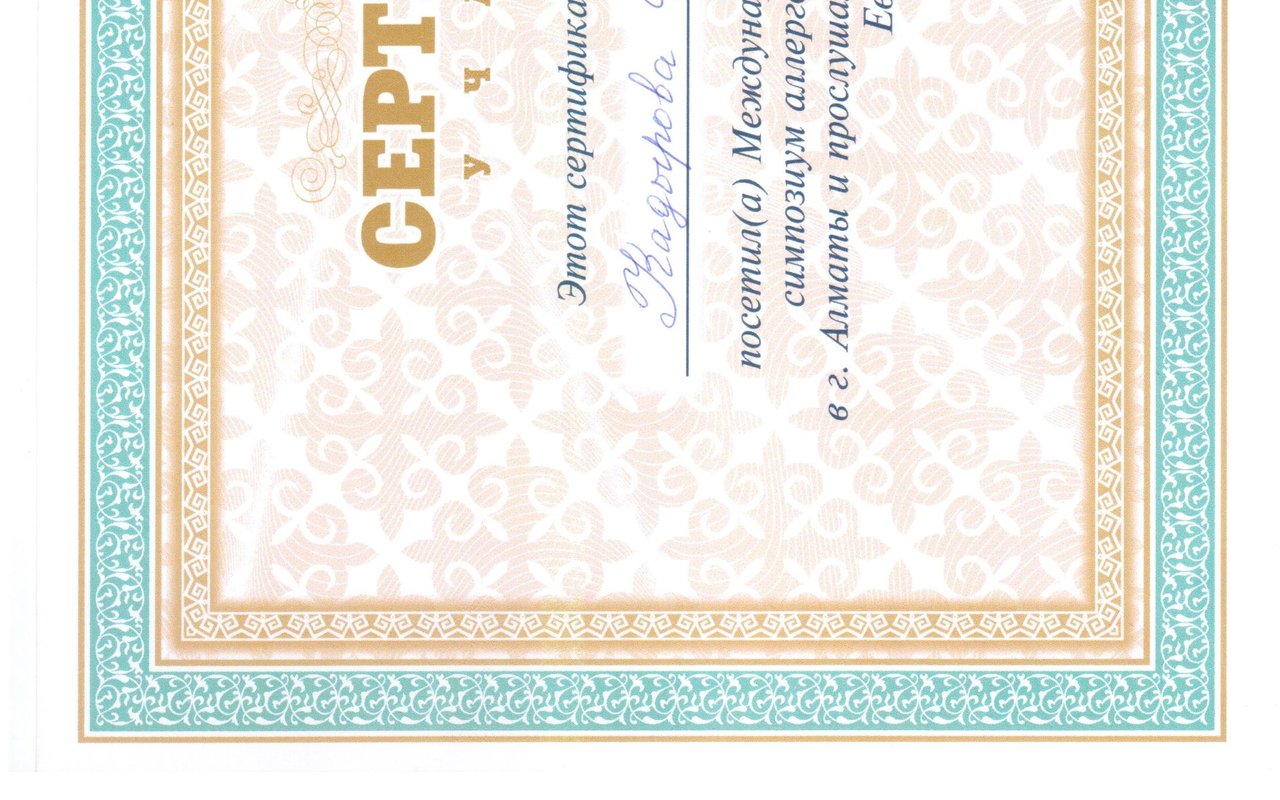 • 2016 г. Алматинский Государственный Институт Усовершенствования врачей,тема: «Специфическая и неспецифическая иммунотерапия аллергических заболеваний»