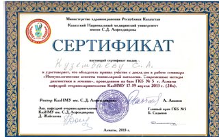2013 – Сертификат специалиста «Иммунологические аспекты тонзиллярной патологии. Современные методы диагностики и лечения», проведенном на базе ГКБ №5, г. Алматы