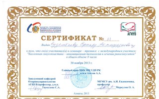 2013 – Сертификат «Инновационные технологии в оториноларингологической практике», г. Алматы