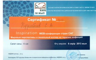 2013 — Сертификат специалиста «Иммунологические аспекты тонзиллярной патологии. Современные методы диагностики и лечения», проведенном на базе ГКБ №5, г. Алматы