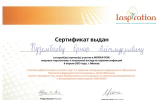 2013 — Сертификат специалиста «Мировые перспективы и локальный взгляд на терапию инфекций», г. Москва