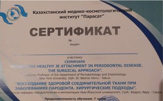 2017 — «Воссоздание здоровой соединительной ткани при заболеваниях пародонта. Хирургические подходы», организатор Казахстанский медико–косметологический институт «Парасат», лектор Бедрос Явру – Сакук (профессор кафедры пародонтологии и имплантации NewYorkUniversity), г. Алматы;