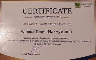 Стоматолог-терапевт-пародонтологАлиева Галия Махмутовна – опытный стоматолог–терапевт–пародонтолог. Внимательный, тактичный и аккуратный доктор, является профессионалом высокого класса, который обеспечит Вам лучшее лечение в максимально комфортных условиях. Галия Махмутовна обладает большим практическим стажем и специализируется в области лечения пациентов с патологией пародонта и слизистой оболочки рта.