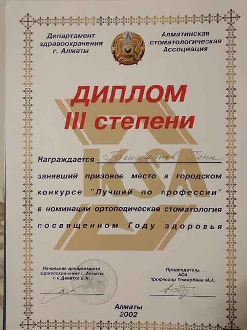 2002 — Призовое место в конкурсе посвященном Году здоровья «Лучший по профессии» в номинации «ортопедическая стоматология», организатор Алматинская стоматологическая ассоциация, г. Алматы.