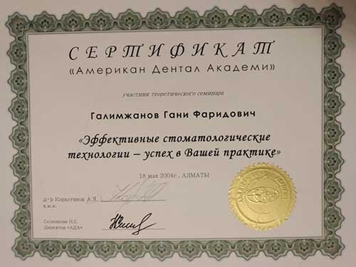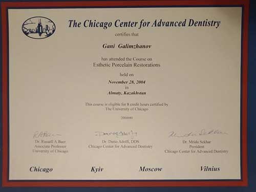 2004 — «Esthetic Porcelain Restoration», организатор The Chicago Center for Advanced Dentistry (The University of Chikago), г. Алматы;