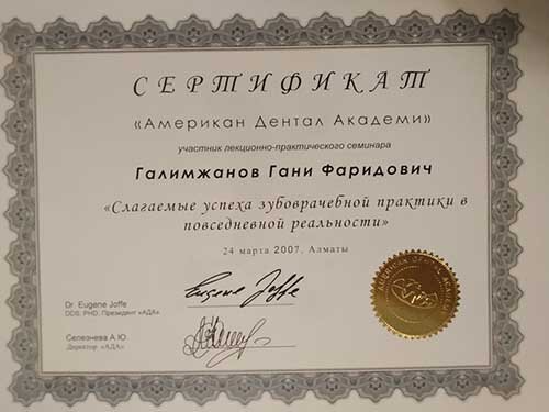 2007 — «Слагаемые успеха зубоврачебной практики в повседневной реальности», организатор American Dental Academy, спикер Dr. EugeneJeffe, DDS, PhD, г. Алматы;