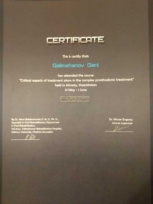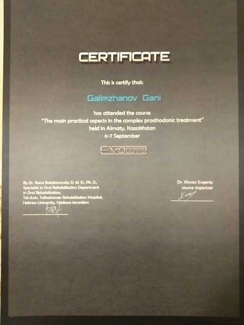 2008 — «ThemainpracticalaspectsinthecomplexProsthodontictreatment», организатор EvoCatio под руководствомЕвгения Хван, спикер Рами Балабановский D.M.D., Ph.D. г. Алматы;