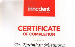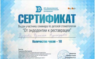 2018 — «Витальная терапия пульпы временных зубов и лечение периодонтитов временных и постоянных зубов», внутреннее обучение Dent-Lux, лектор Геранина Е., г. Алматы;