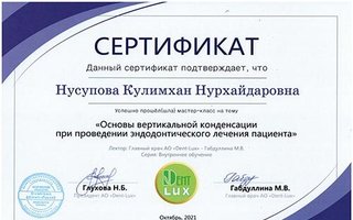 2021 — «Основы вертикальной конденсации при проведении эндодонтического лечения пациента», внутреннее обучение Dent-Lux, лектор Габдуллина М. В., г. Алматы;