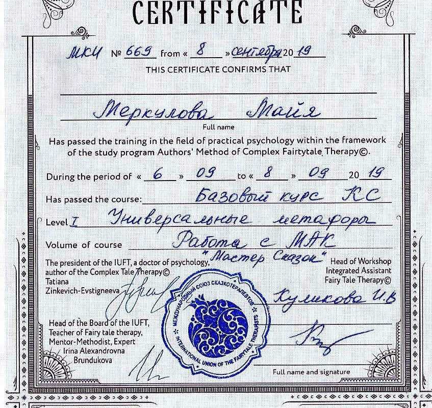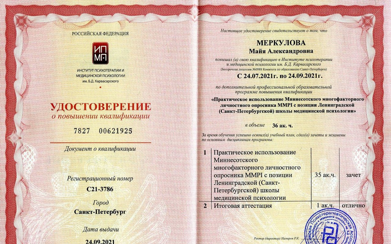 Клинический психологПрактикующий психолог. Клинический психолог. Сертифицированный специалист в области немедикаментозной коррекции психоэмоционального, нейрогормонального и иммунного статуса человека (г. Новосибирск НИИ Физиологии). Телесно-Ориентированный психотерапевт. Арт терапевт ( г. Санкт- Петербург).