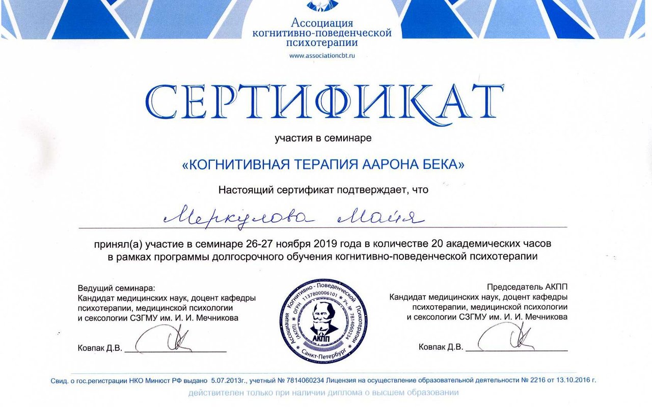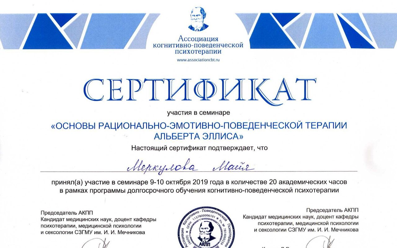 Член Ассоциации Когнитивно- Поведенческой Психотерапии
