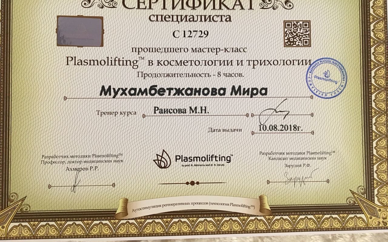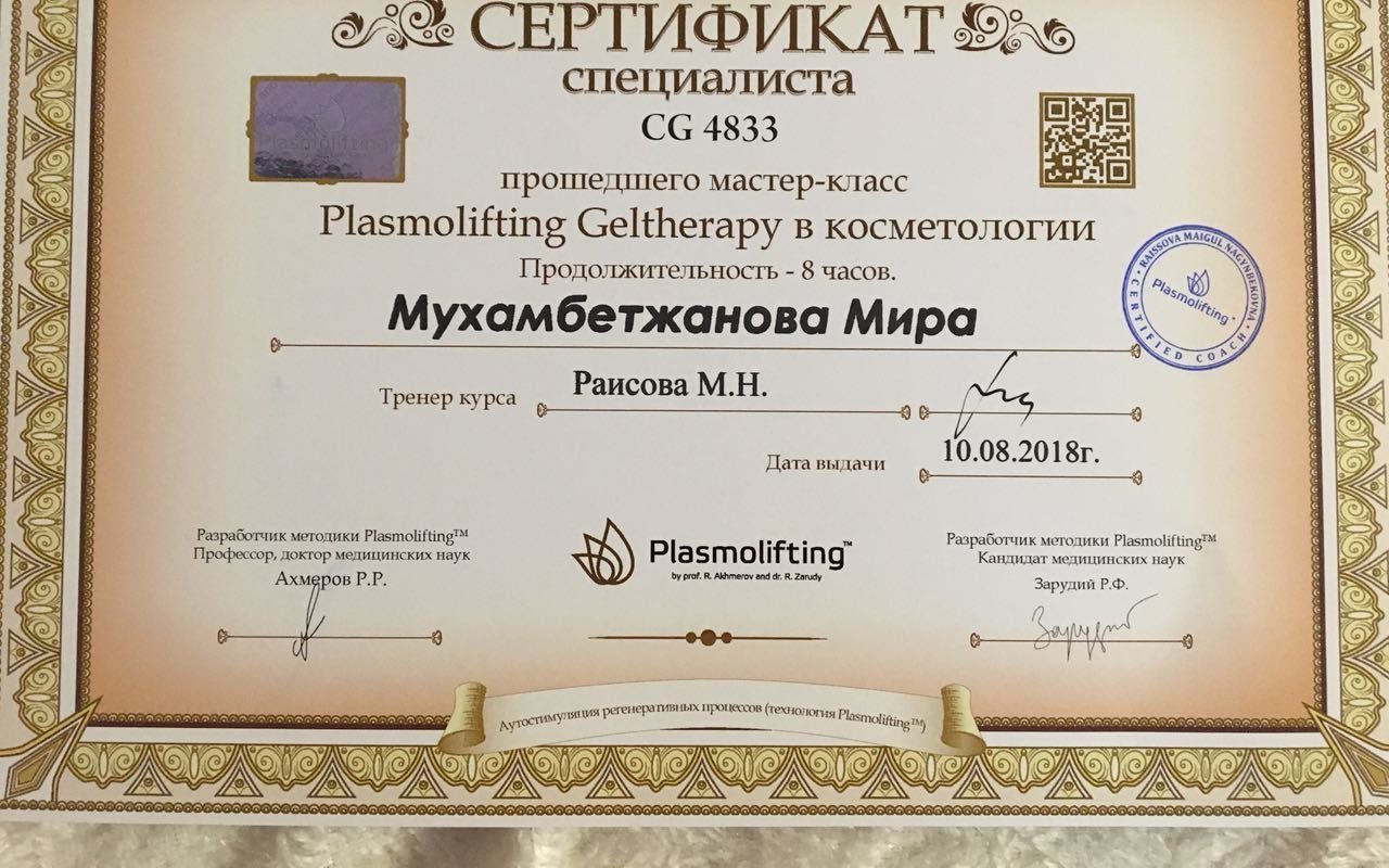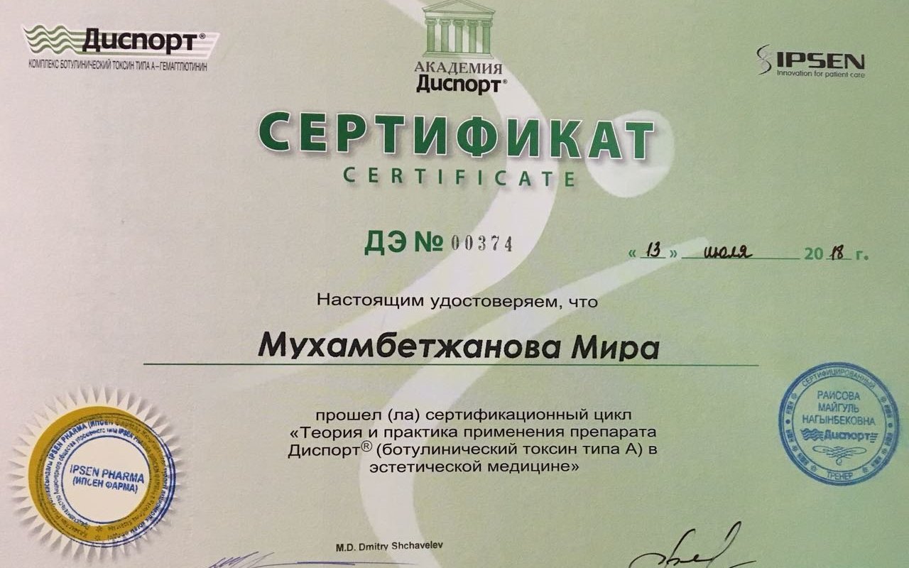2002 г. – Курс первичной специализации “Взрослая онкология“; 2002 г. – Сертифицированный цикл “Диагностика и лечение заболеваний ЖКТ“ на базе Каз НИИОИР; 2005 г., 2010 г. – Сертифицированные циклы “Диагностика и лечение злокачественных образований молочной железы“ на базе КазНИИОИР; 2013 г. – Присвоена квалификация врача высшей категории по специальности взрослой онкологии; 2013 г. - Курс первичной специализации “Дерматовенерология и дерматокосметология“ на базе АГИУВ; 2014 г. – Сертификационный цикл “Мезотерапия“ на базе учебного центра ТЭКОМ; 2014 г. - Сертификационный цикл “Современные пилинги“ на базе учебного центра ТЭКОМ; 2014 г. – Сертификационный цикл “Лечение косметических дефектов кожи методом фракционного фототермолиза“ с применением аппарата лазерного терапевтического Clear+Brilliant на базе клиники Premium Aesthetics ( компания Solta Mediсal), г. Москва; 2014 г. – Сертификационный цикл “Трехмерное уплотнение кожи методом монополярного, радиочастотного воздействия“ с применением аппарата ThermaCool CPT на базе клиники Premium Aesthetics (компания Solta Mediсal), г. Москва; 2014 г. – Сертификационный цикл “Лазерная косметология и дерматология“ на базе обучающего центра Фотона, г. Москва; 2014 г. - Сертификационный цикл “Лазерные технологии вагинальной подтяжки и лечения стрессового недержания мочи“ на базе обучающего центра Фотона, г. Москва