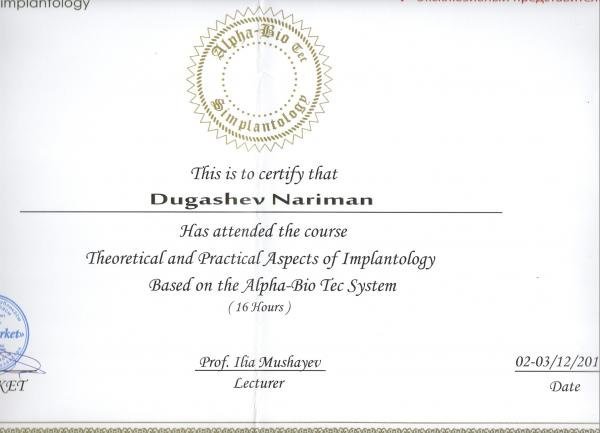 Дугашев Нариман Мудинович работает в сфере стоматологической хирургии и имплантологии. К нему приходят на прием, когда необходимо реконструировать целостность зубных рядов, сделать улыбку красивой и получить возможность вновь полноценно пережевывать пищу. Нариман Дугашев также может подобрать зубные импланты и грамотно организовать все сопутствующие манипуляции по подготовке и вживлению импланта.... Показать еще