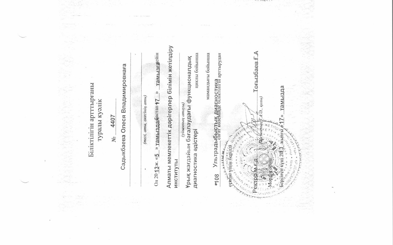 2013г. - прошла прошла повышение квалификации по специальности: Ультразвуковая диагностика по циклу "Методы функциональной диагностики в оценке состояния плода".