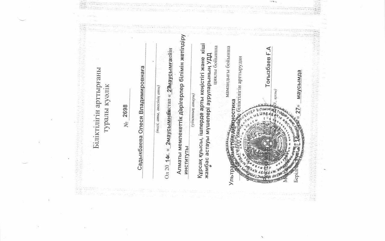 2014г. - выдан Сертификат специалиста по специальности "Лучевая диагностика (ультразвуковая диагностика)".