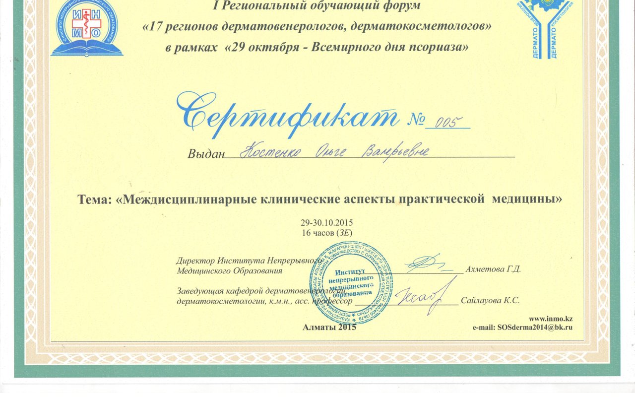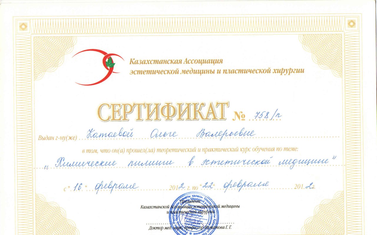 Дополнительное образование: курсы обучения в Казахстанской Ассоциации эстетической медицины и пластической хирургии по теме «Химические пилинги в эстетической медицине», курсы в центр «VIP CENTRE MILANA» по теме «Аппаратная косметология».