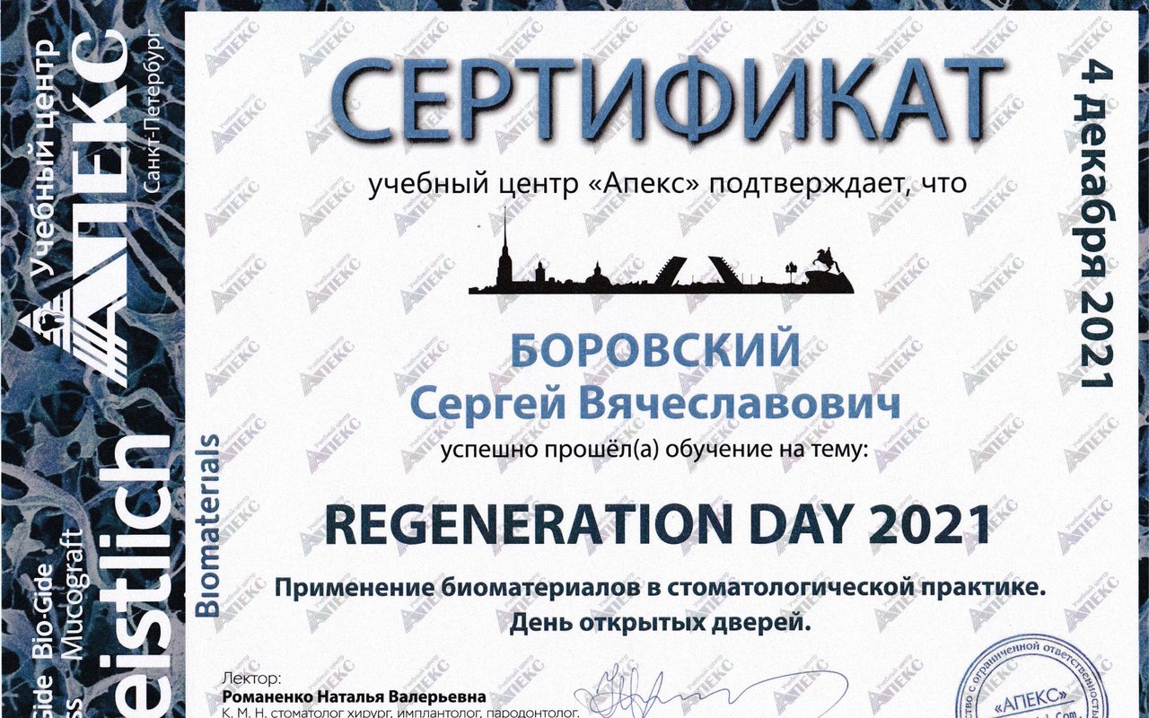 2021 — «REGENERATION DAY 2021. Применение биоматериалов в стоматологической практике», организатор учебный центр «Апекс» при поддержке компании Geistlich Pharma AG, спикеры Алгазин И. А., Васильев С. Ю., г. Санкт–Петербург;