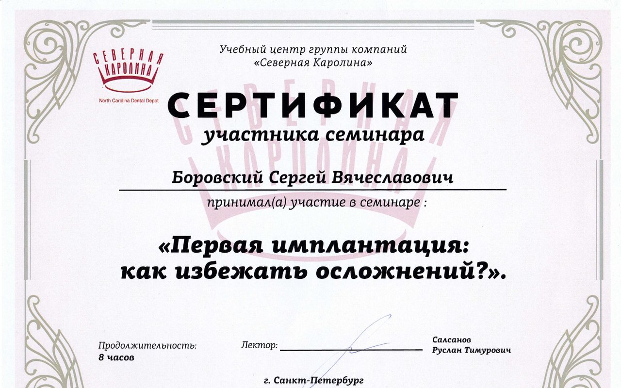 2019 — «Первая имплантация: как избежать осложнений?», организатор учебный центр группы компаний «Северная Каролина», лектор Салсанов Р. Т., г. Санкт–Петербург.