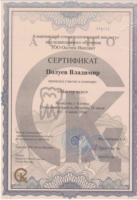 Полуев Владимир Иванович, один из лучших имплантологов, ортопедов и ортодонтов в Казахстане. Успешно практикует уже более 29 лет. Проходил стажировку у лучших зарубежных специалистов и продолжает совершенствовать свой профессиональный уровень каждый день. На сегодняшний день главный врач клиники "dr. Poluev dental clinic"... Показать еще