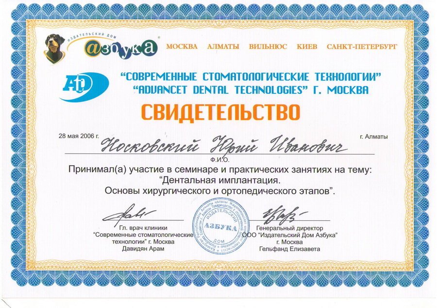 Носковский Юрий Иванович является стоматологом-ортопедом, а также работает в сфере имплантологии. Вы можете записаться к Юрию Носковскому, если вам требуется установить имплант или если какой-то из зубов находится в таком состоянии, что с помощью простой пломбы его не спасти. Протезирование предполагает обязательную санацию зубов, поэтому перед визитом к ортопеду стоит посетить стоматолога-терапевта.... Показать еще