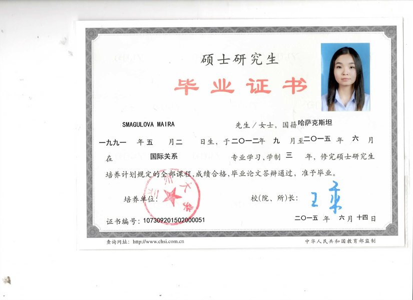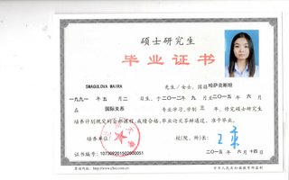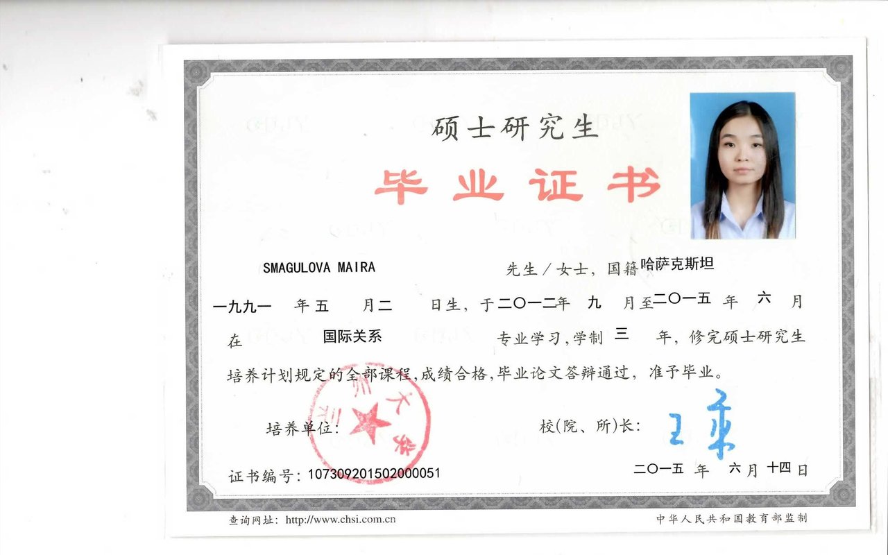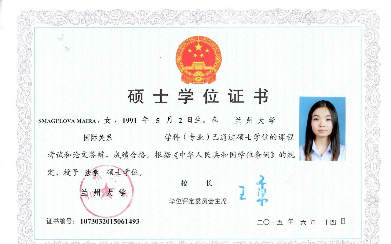 Магистратура: Ланчжоуский Университет, специальность: Международные отношения