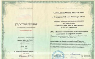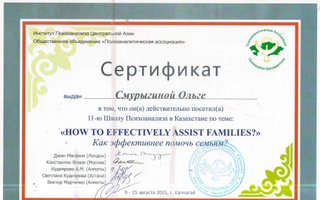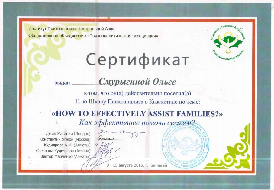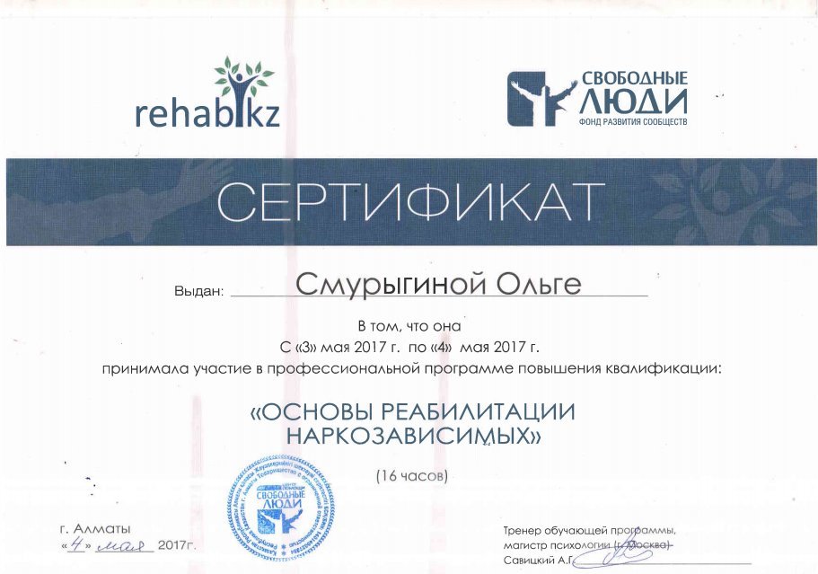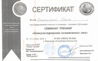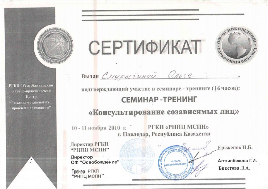 школа консультантов при РНПЦ МСПН г. Павлодар; • 10-ая Школа Психоанализа по теме: «От зависимости к Независимости»; • 11-ая Школа Психоанализа по теме: «Как эффективнее помочь семьям»; • обучение при РГКП «Республиканский научно-практический Центр медико-социальных проблем наркомании» в 2010—13г. г: • Когнитивно-поведенческие подходы в консультирование зависимых от психоактивных веществ; • Тренинг для тренеров по профилактике наркомании; • Мотивационное консультирование; • Информационно-образовательный компонент программ снижения вреда в наркологической практике; • Реабилитационный менеджмент и система самоуправления; • Консультирование созависимых лиц