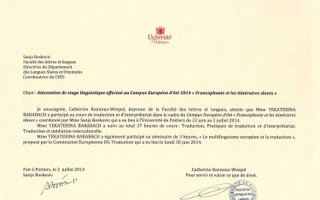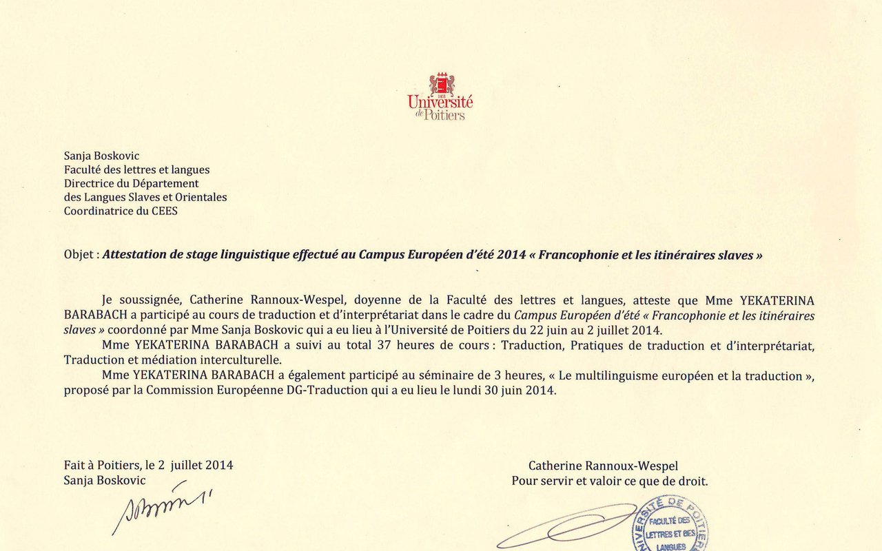 2014 — Université de Poitiers (г. Пуатье, Франция), сертификат по образовательной программе Langues et traduction: francophonie et itinéraires slaves