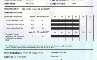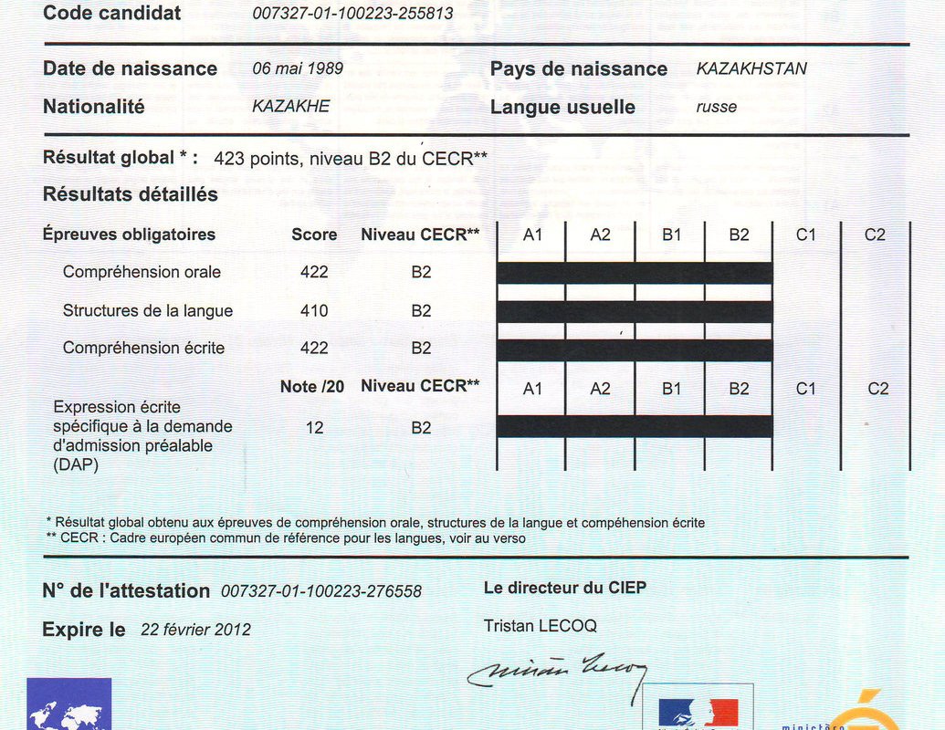 2012 — Alliance Française d'Almaty Сертификат о прохождении курса TCF/DAP (уровень B2)
