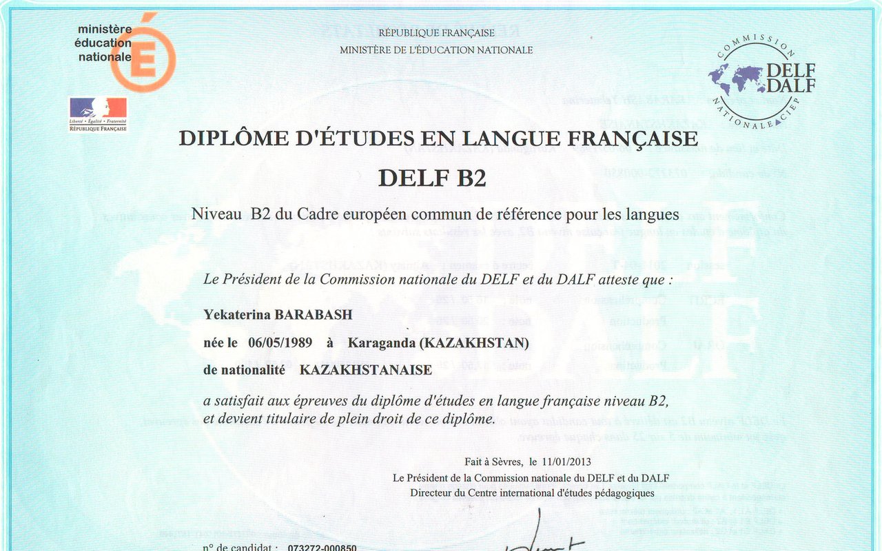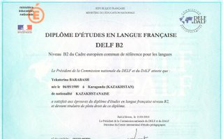 2013 — Alliance Française d'Almaty Диплом о прохождении курса DELF B2.