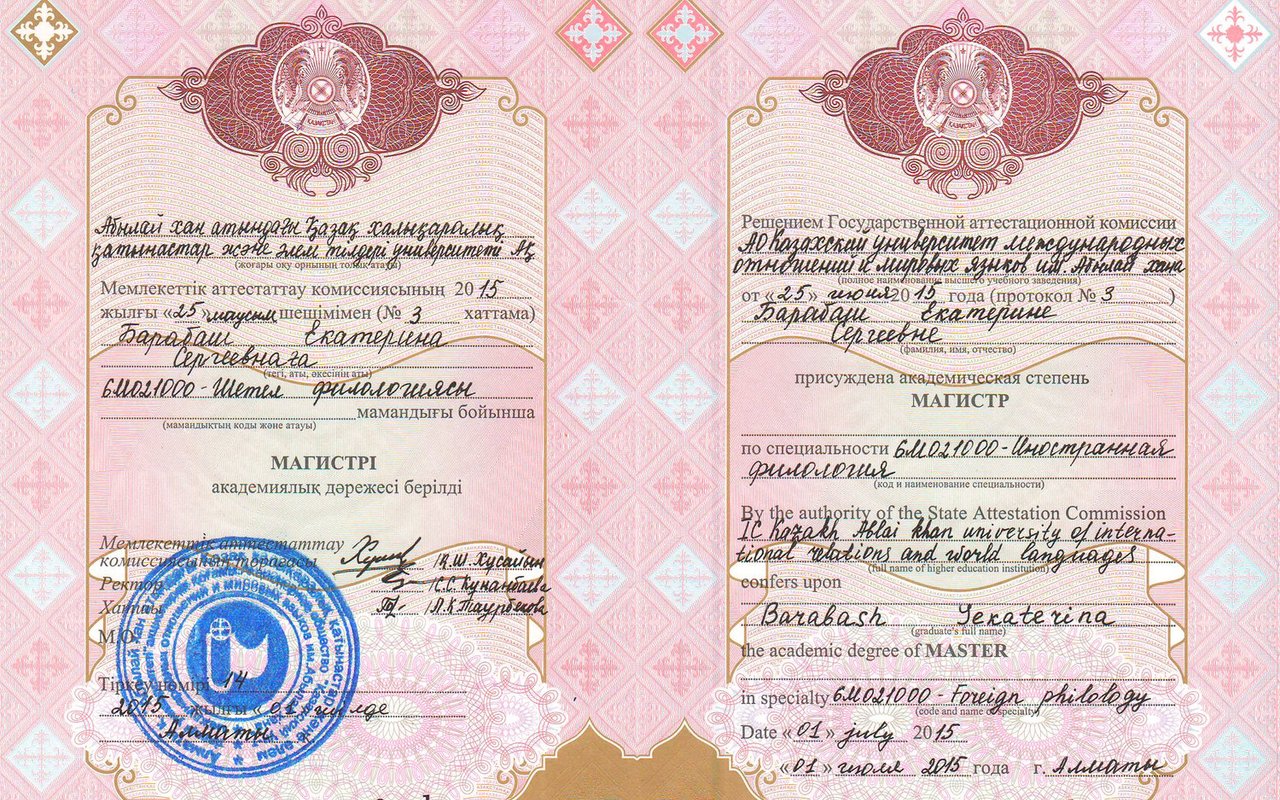 2013–2015 — КазУМОиМЯ им. Абылай-хана, Факультет романо-германской филологии, Специальность – иностранная филология, магистр