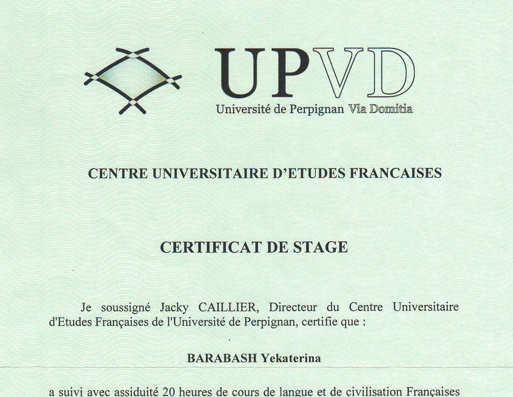 2011 — UPVD – Université de Perpignan, сертификат о прохождении курса французского языка (уровень C1).