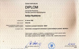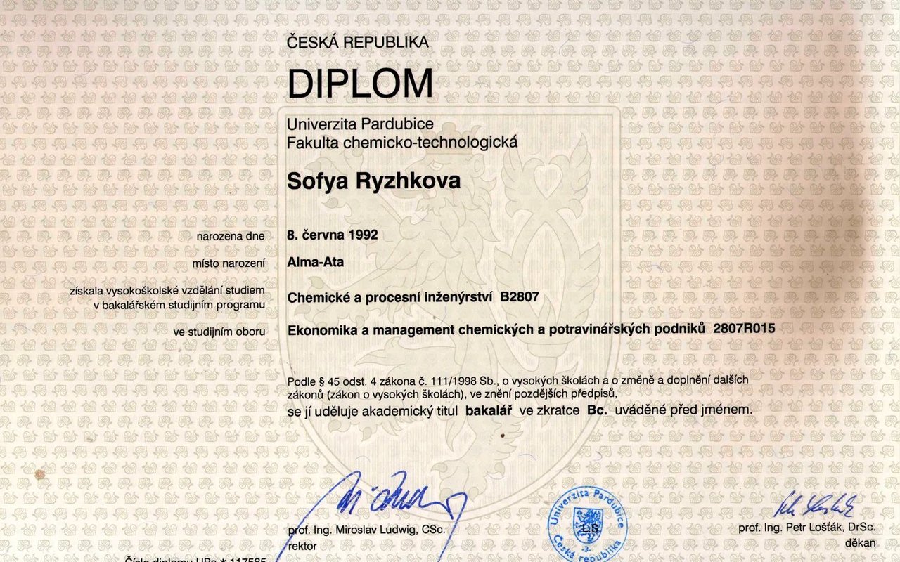 2014 — Университет Пардубице (Univerzita Pardubice), Чехия, химико-технологический факультет, специальность – экономика и менеджмент пищевых и химических предприятий